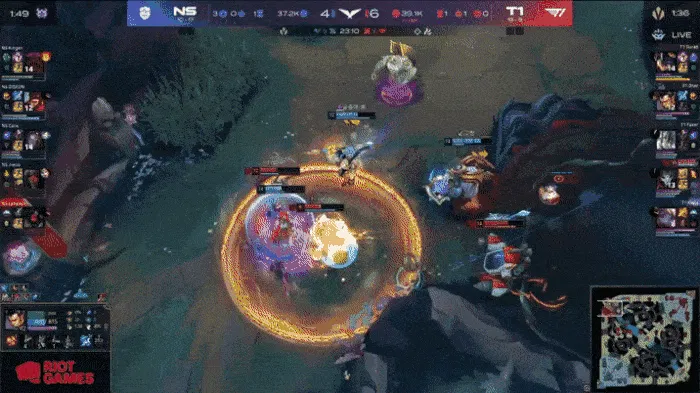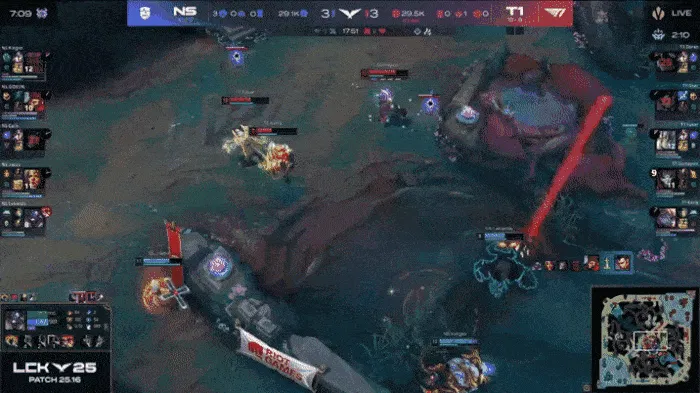 比赛第25分钟,两队在下路爆发团战,NS牛头发条打出小配合顶起三人,但T1轻松打出1换5团灭NS。